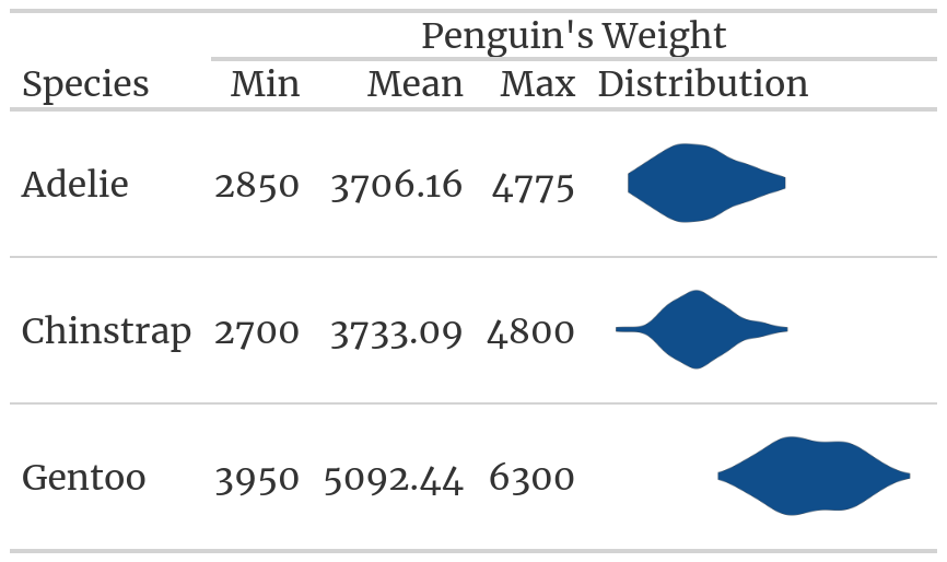 filtered_penguins <- palmerpenguins::penguins |>filter(!is.na(sex))penguin_weights <- palmerpenguins::penguins |>filter(!is.na(sex)) |>group_by(species) |>summarise(Min =min(body_mass_g),Mean =mean(body_mass_g) |>round(digits =2),Max =max(body_mass_g) ) |>mutate(species =as.character(species), Distribution = species) |>rename(Species = species)plot_density_species <-function(species, variable) { full_range <- filtered_penguins |>pull({{variable}}) |>range() filtered_penguins |>filter(species ==!!species) |>ggplot(aes(x = {{variable}}, y = species)) +geom_violin(fill ='dodgerblue4') +theme_minimal() +scale_y_discrete(breaks =NULL) +scale_x_continuous(breaks =NULL) +labs(x =element_blank(), y =element_blank()) +coord_cartesian(xlim = full_range)}penguins <- penguin_weights |>gt() |>tab_spanner(label ='Penguin\'s Weight',columns =-Species ) |>text_transform(locations =cells_body(columns ='Distribution'),# Create a function that takes the a column as input# and gives a list of ggplots as outputfn =function(column) {map(column, ~plot_density_species(., body_mass_g)) |>ggplot_image(height =px(50), aspect_ratio =3) } ) |>tab_options(table.font.names ='Merriweather') |>opt_css('.gt_table { line-height:10px; }' )