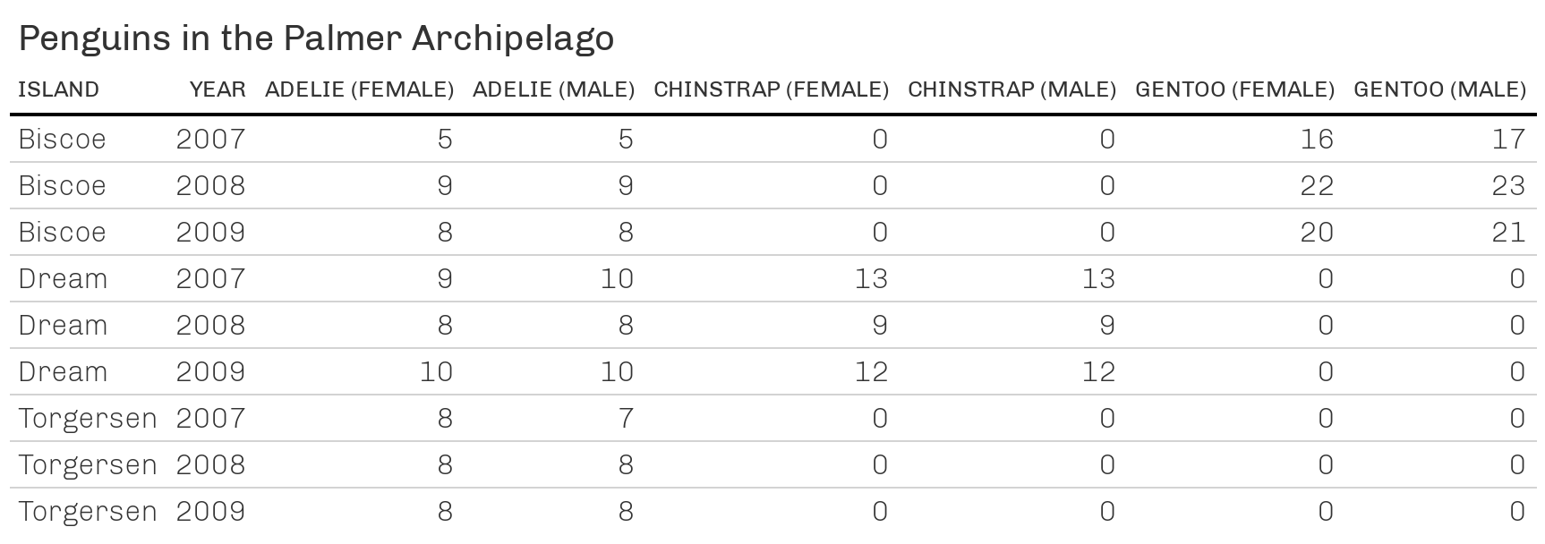 library(tidyverse)library(gt)library(gtExtras)penguins <- palmerpenguins::penguins |>filter(!is.na(sex))counts <- penguins |>mutate(year =as.character(year)) |>group_by(species, island, sex, year) |>summarise(n =n(), .groups ='drop')counts_wider <- counts |>pivot_wider(names_from =c(species, sex),values_from = n ) |>arrange(year) |># This will arrange each island as 07-08-09-totalmutate(island =paste('Island:', island)) |>ungroup()tbl <- counts_wider |>mutate(island =str_remove(island, 'Island: '),across(.cols =-(1:2), .fns =~replace_na(., replace =0)) ) |>arrange(island) |>gt(id ='asdsdag') |>cols_label('island'='Island',year ='Year',Adelie_female ='Adelie (female)',Adelie_male ='Adelie (male)',Chinstrap_female ='Chinstrap (female)',Chinstrap_male ='Chinstrap (male)',Gentoo_female ='Gentoo (female)',Gentoo_male ='Gentoo (male)', ) |>tab_header(title ='Penguins in the Palmer Archipelago') |>tab_options(heading.align ='left' ) |>gt_theme_538()